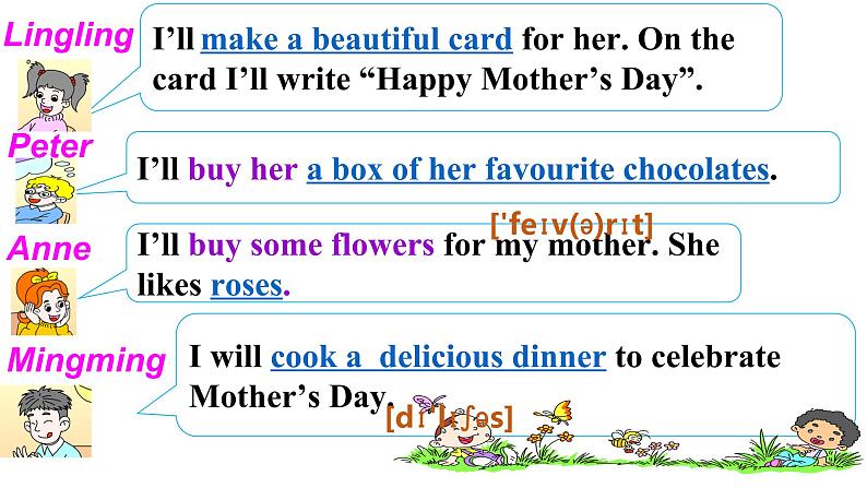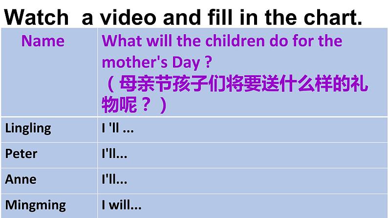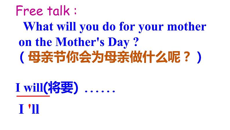 Free talk : What will yu d fr yur mther n the Mther's Day ?(母亲节你会为母亲做什么呢?)I will(将要)