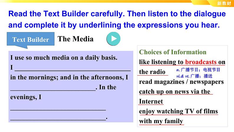 展开T talk abut the mediaT listen fr general understandingT listen fr specific infrmatin and understanding wrds in cntext
