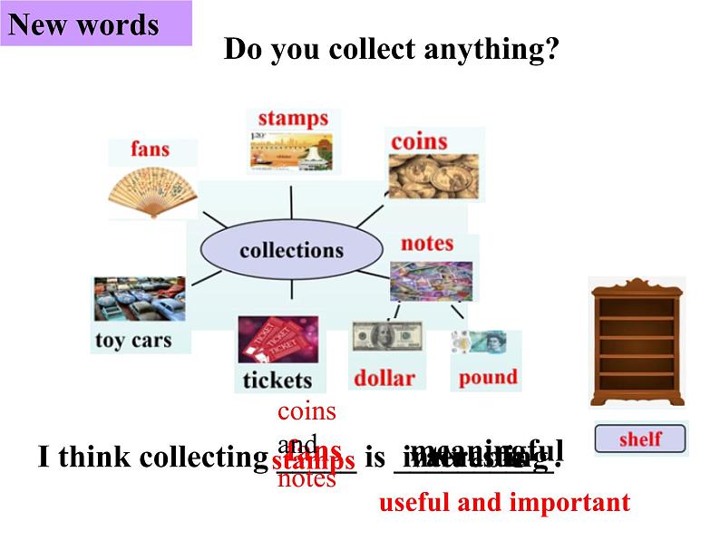 这是一份外研版 (新标准)八年级下册Unit 1 Do you collect anything ?课文内容课件ppt,共21页。PPT课件主要包含了Hobbies,collect,New words, fans,stamps,meaningful,valuable, adjn,n 复,shelf等内容,欢迎下载使用。