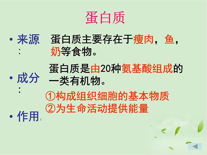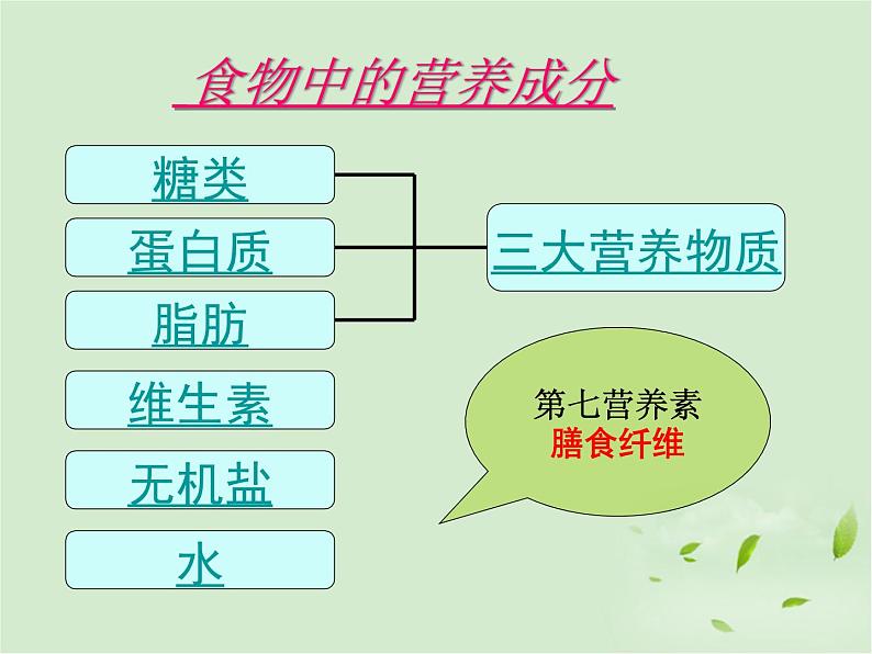 这是一份初中生物济南版七年级下册第一节 食物的营养成分授课ppt课件,共24页。PPT课件主要包含了蛋白质,三大营养物质,维生素,维生素A,维生素B1,维生素D,简记歌谣,无机盐等内容,欢迎下载使用。