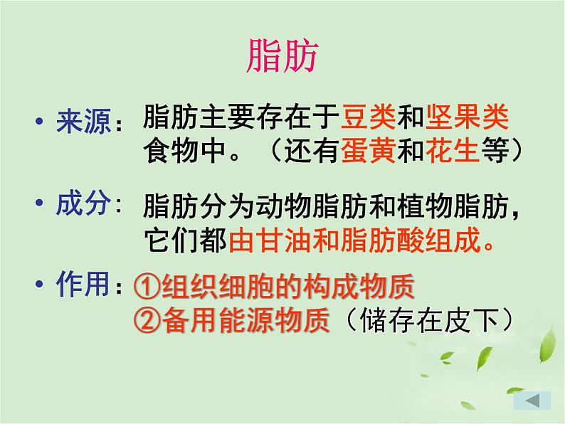 ①组织细胞的构成物质②备用能源物质(储存在皮下)
