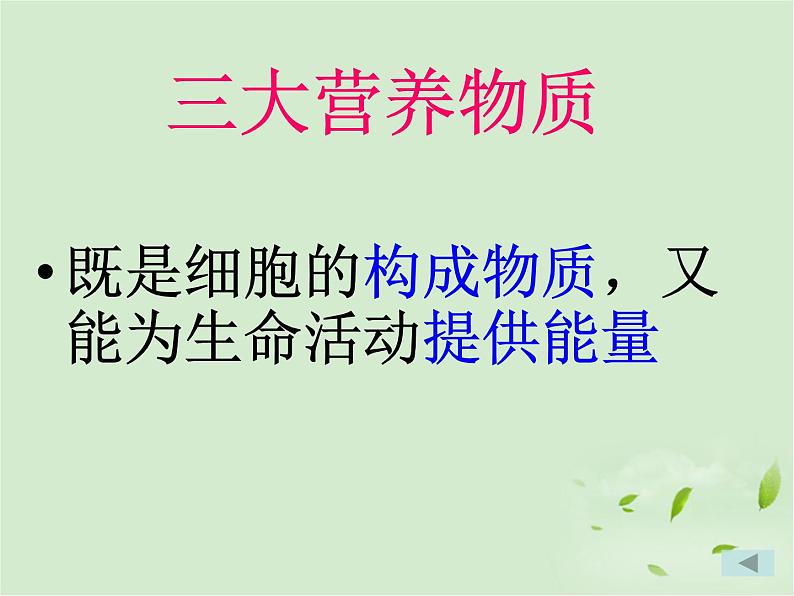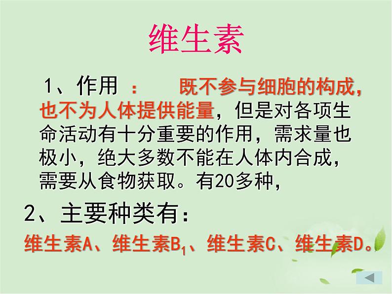 1、作用 : 既不参与细胞的构成,也不为人体提供能量,但是对各项生命活动有十分重要的作用,需求量也极小,绝大多数不能在人体内合成,需要从食物获取。有20多种,2、主要种类有:维生素A、维生素B1、维生素C、维生素D。