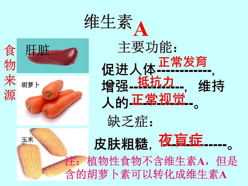 注:植物性食物不含维生素A,但是含的胡萝卜素可以转化成维生素A