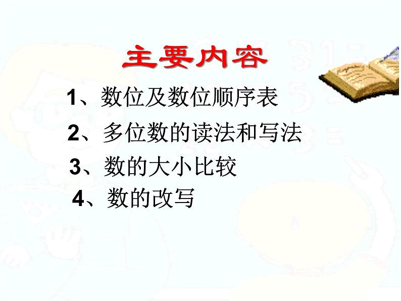 这是一份苏教版四年级下册二 认识多位数教学ppt课件,共28页。PPT课件主要包含了主要内容,数的改写,用万作单位,练一练等内容,欢迎下载使用。