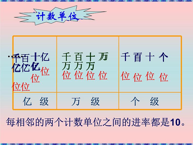 2、从个位起第( )位是万位,它的计数单位是( );第八位是( )位,它的计数单位是( )。