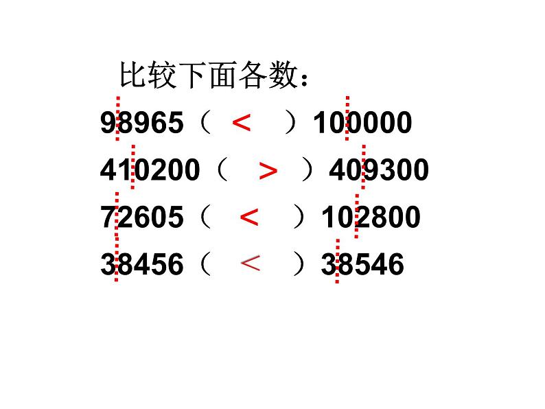 比较下面各数: 98965( )100000 410200( )409300 72605( )102800 38456( )38546