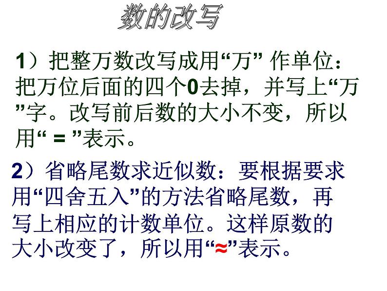 2)省略尾数求近似数:要根据要求用“四舍五入”的方法省略尾数,再写上相应的计数单位。这样原数的大小改变了,所以用“≈”表示。