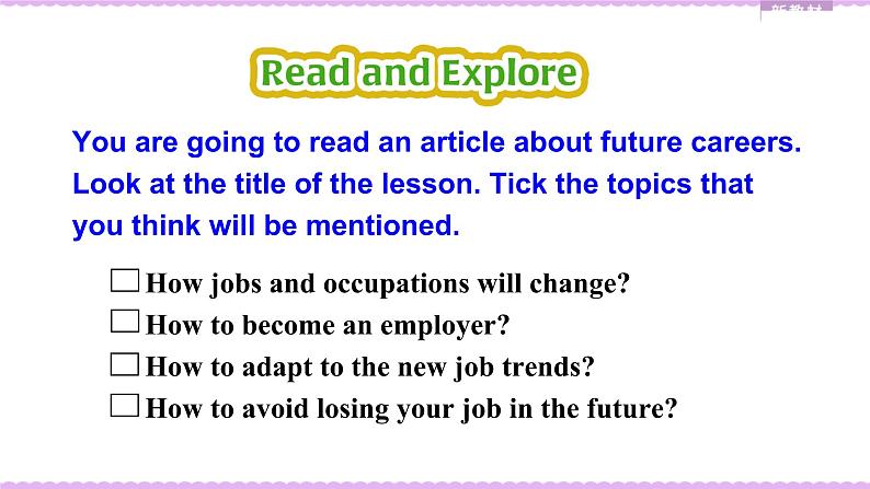 Yu are ging t read an article abut future careers. Lk at the title f the lessn. Tick the tpics that yu think will be mentined.