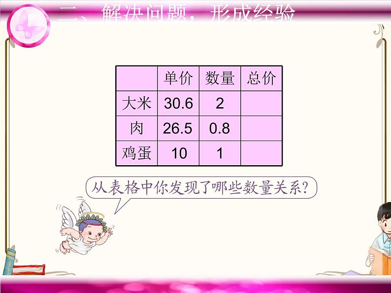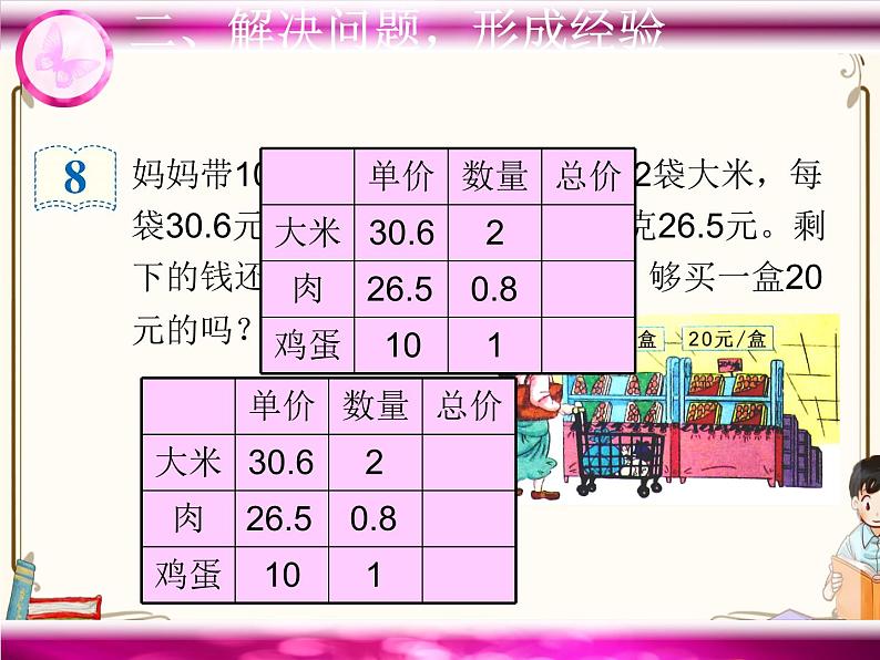 解决问题第一单元:小数乘法1.用简便方法计算下面各题。 3.14×12.5×0.08 =3.14×(12.5×0.08) =3.14×1 =3.14 一、复习铺垫,谈话引入 5.28×99+5.28=5.28×(99+1)=5.28×100=5283.8×3< 2.在方框里填上合适的整数。 一、复习铺垫,谈话引入121.78×3.98< 2.5×4.12> 6.1×3.08> 81018放大成4×3 放大成2×4 缩小成2.5×4 缩小成6×3 妈妈带100元去超市购物。她买了2袋大米,每袋30.6元。还买了0.8 kg肉,每千克26.5元。剩下的钱还够买一盒10元的鸡蛋吗?够买一盒20元的吗?二、解决问题,形成经验二、解决问题,形成经验妈妈带100元去超市购物。她买了2袋大米,每袋30.6元。还买了0.8 kg肉,每千克26.5元。剩下的钱还够买一盒10元的鸡蛋吗?够买一盒20元的吗?30.6226.50.8101妈妈带100元去超市购物。她买了2袋大米,每袋30.6元。还买了0.8kg肉,每千克26.5元。剩下的钱还够买一盒10元的鸡蛋吗?够买一盒20元的吗?二、解决问题,形成经验二、解决问题,形成经验二、解决问题,形成经验二、解决问题,形成经验自主活动要求想一想:你准备用什么方法来解决?做一做:根据自己的想法写出解答过程。说一说:你是怎样思考的?二、解决问题,形成经验30.6226.50.8101剩下的钱:100-82.4=17.6(元) 17.6元>10元,17.6元<20元 答:剩下的钱还够买一盒10元的鸡蛋, 不够买一盒20元的鸡蛋。大米和肉的总价: 30.6×2+26.5×0.8=61.2+21.2=82.4(元)二、解决问题,形成经验30.6226.50.8101答:剩下的钱还够买一盒10元的鸡蛋。大米:<31元大米:<31元肉:<27元鸡蛋:10元总价不超过:31+31+27+10=99(元)二、解决问题,形成经验30.6226.50.8201答:剩下的钱不够买一盒20元的鸡蛋。大米:>30元大米:>30元肉:>20元鸡蛋:20元总价就超过:30+30+20+20=100(元)理一理、议一议(1)我们刚才是怎样解决这个问题的? (2)我们刚才解决的这个问题有什么特点? (3)解决这样的问题,你觉得用什么方法解答更简便? 二、解决问题,形成经验想一想、说一说 我们用了两种不同的估算方法解决问题,这 两种估算方法有什么不同? 二、解决问题,形成经验 用估算解决实际问题时,要根据问题的具体情况和数据特点选择适当的估算策略。 (1)要判断“够”的话,所有的数据都要估大或不变; (2)要判断“不够”的话,所有的数据都要估小或不变。 (3)估的时候要注意估大或估小要适度,要能解决问题。二、解决问题,形成经验三、巩固练习,内化提升 2. 30元钱买下面的东西够吗?和同桌说一说你是 怎么算的。 三、巩固练习,内化提升妈妈带 元去超市购物。她买了2袋大米,每袋30.6元。还买了0.8 kg肉,每千克26.5元。剩下的钱还够买一盒10元的鸡蛋吗?10095 够买一盒20元的吗?变化:30.6226.50.8101答:剩下的钱还够买一盒10元的鸡蛋。大米:<31元大米:<31元肉:<27元鸡蛋:10元总价不超过:31+31+22+10=94(元)三、巩固练习,内化提升20×0.8=16(元)7×0.8<6(元)16+6=22(元)肉:<22元三、巩固练习,内化提升3.一个房间长8.1 m,宽5.2 m。 现在要铺上边长为0.6 m的正 方形地砖,100块够吗? (不考虑损耗。)(1)解决“100块够吗”这个问题,就是要比较哪两个面积的大小?(2)怎样比较房间面积和100块地砖面积的大小?三、巩固练习,内化提升4.王老师从家骑车到学校要 用0.25小时,家离学校有 多远?如果他改为步行, 每小时走5 km,用0.8小时 能到学校吗? (1)这题的两问之间有什么关系? (2)解决第二问就是要比较什么与什么的大小?1.今天这节课学习的是什么内容?你有哪些收获?2.用估算解决问题,要根据实际问题和数据特点选择适当的估算方法。那么,你在选择估算方法上有什么体会?四、全课总结,分享经验五、作业练习课堂作业:练习四第1题(第二行), 练习四第4题。家庭作业:练习四第1题(第一行), 练习四第5题。