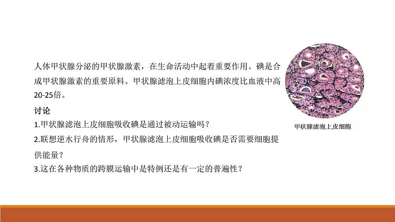 人体甲状腺分泌的甲状腺激素,在生命活动中起着重要作用。碘是合成甲状腺激素的重要原料。甲状腺滤泡上皮细胞内碘浓度比血液中高20-25倍。讨论1.甲状腺滤泡上皮细胞吸收碘是通过被动运输吗?2.联想逆水行舟的情形,甲状腺滤泡上皮细胞吸收碘是否需要细胞提供能量?3.这在各种物质的跨膜运输中是特例还是有一定的普遍性?