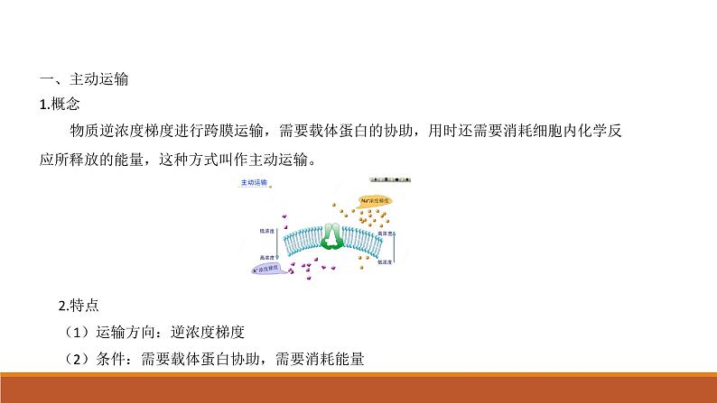 一、主动运输1.概念 物质逆浓度梯度进行跨膜运输,需要载体蛋白的协助,用时还需要消耗细胞内化学反应所释放的能量,这种方式叫作主动运输。