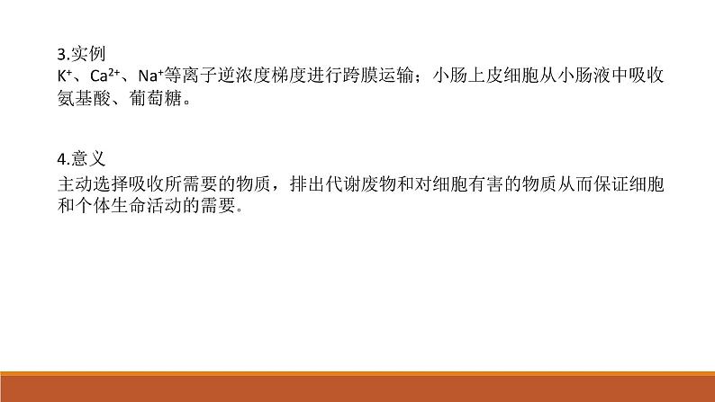 3.实例K+、Ca2+、Na+等离子逆浓度梯度进行跨膜运输;小肠上皮细胞从小肠液中吸收氨基酸、葡萄糖。4.意义主动选择吸收所需要的物质,排出代谢废物和对细胞有害的物质从而保证细胞和个体生命活动的需要。