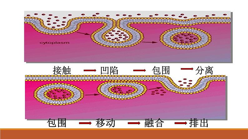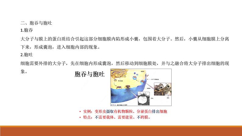 二、胞吞与胞吐1.胞吞大分子与膜上的蛋白质结合引起这部分细胞膜内陷形成小囊,包围着大分子。然后,小囊从细胞膜上分离下来,形成囊泡,进入细胞内部的现象。2.胞吐细胞需要外排的大分子,先在细胞内形成囊泡,然后移动到细胞膜处,并与之融合将大分子排出细胞的现象。