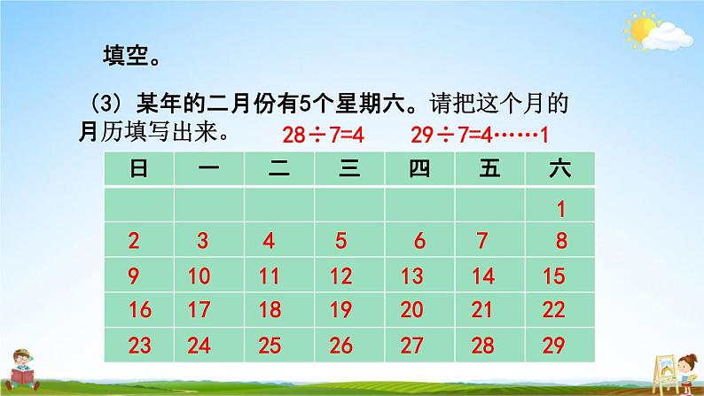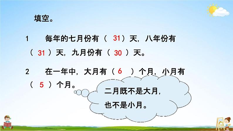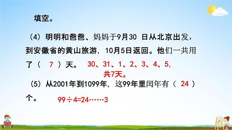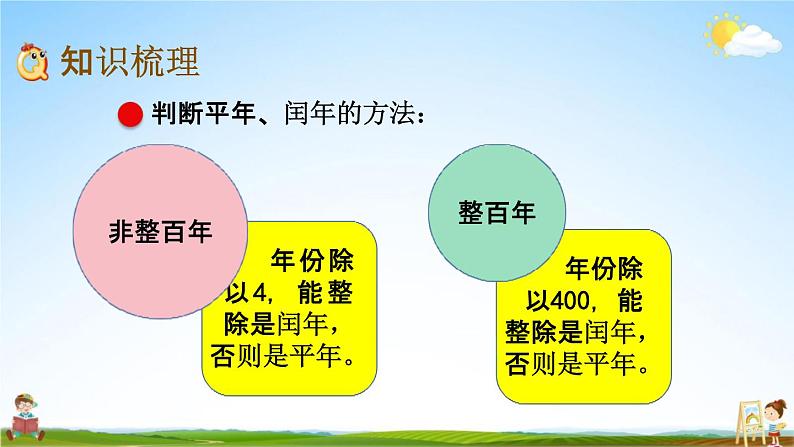 年、月、日及吨的认识11 总复习复习导入,说一说,这一年 是平年还是闰年 一年有多少天?年份除 以400,能整除是闰年, 否则是平年。年份除 以4,能整 除是闰年,否则是平年。知识梳理判断平年、闰年的方法:整百年非整百年每个月的天数规律一三五七八十腊, 三十一天用不差。平年二月28天, 闰年二月29天。平年全年365天, 闰年全年366天。填空。每年的七月份有( 31 )天,八年份有( 31 )天,九月份有( 30 )天。在一年中,大月有( 6 )个月,小月有( 5 )个月。二月既不是大月, 也不是小月。填空。(3)某年的二月份有5个星期六。请把这个月的月历填写出来。28÷7=4 29÷7=4……1个。99÷4=24……3填空。(4)明明和爸爸、妈妈于9月30 日从北京出发, 到安徽省的黄山旅游,10月5日返回。他们一共用 了( 7 )天。 30、31、1、2、3、4、5,共7天。(5)从2001年到1099年,这99年里闰年有( 24 )还记得关于吨的知识吗?比千克重的质量用吨表示。1吨=1000千克1千克=1000克1t=1000kg 1kg=1000g比大小时,先统一单位。巩固练习期零( )天。填空。1.一年有( 12 )个月,3月份有( 31 )天,第三季度有( 92 )天。2.2019年2月份有( 28 )天,全年有( 52 )个星13.中华人民共和国是(1949 )年( 10 )月( 1 ) 日成立的,她70岁是( 2019)年。填空。5吨=(5000)千克 2000千克=( 2 )吨1600千克-600千克=( 1 )吨1吨-40千克=( 960 )千克一只大象体重4( 吨 ),合( 4000 )千克。4.7月4日开始放暑假9月1日开学,暑假共放了60天。( × )共59天。D.12月)。A.2月 B.5月 C.6月(2)火箭从地球飞到月球历时3( A.小时 B.天 C.月D.年将正确答案前的字母填在括号里。(1)下面各月中,只有30天的月份是( C )。B连一连。50t80kg6kg350g用两辆载重2吨的货车运这些机器,怎样装车能一 次运走?答案不唯一600+400=1000(千克)1000+800=1800(千克)1000+700=1700(千克)谢谢观看Thank You