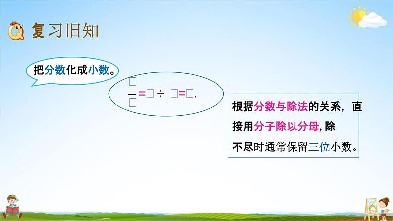 这是一份数学五年级下册四 分数的意义和基本性质教学ppt课件,共11页。PPT课件主要包含了用分子除以分母,除不尽保留三位等内容,欢迎下载使用。