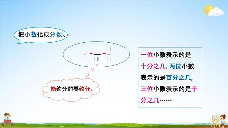这节课你们都学会了哪些知识?把分数化成小数,通常用分子除以分母,除不尽按题目 要求取近似数。把小数化成分数,通常化成分母是10、100、1000……的 分数,能约分的要约分。