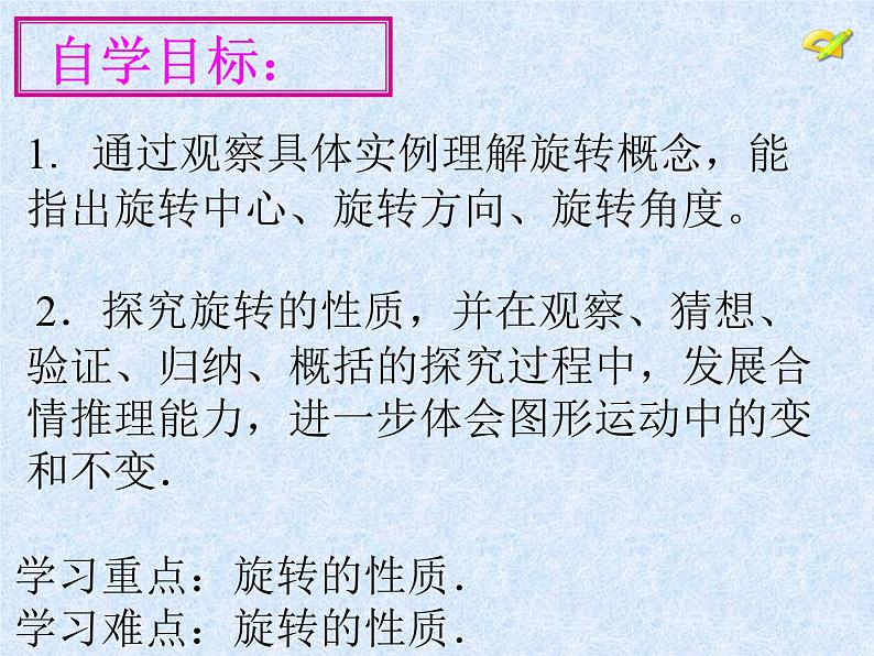 1.通过观察具体实例理解旋转概念,能指出旋转中心、旋转方向、旋转角度。 2.探究旋转的性质,并在观察、猜想、验证、归纳、概括的探究过程中,发展合情推理能力,进一步体会图形运动中的变和不变. 学习重点:旋转的性质. 学习难点:旋转的性质.