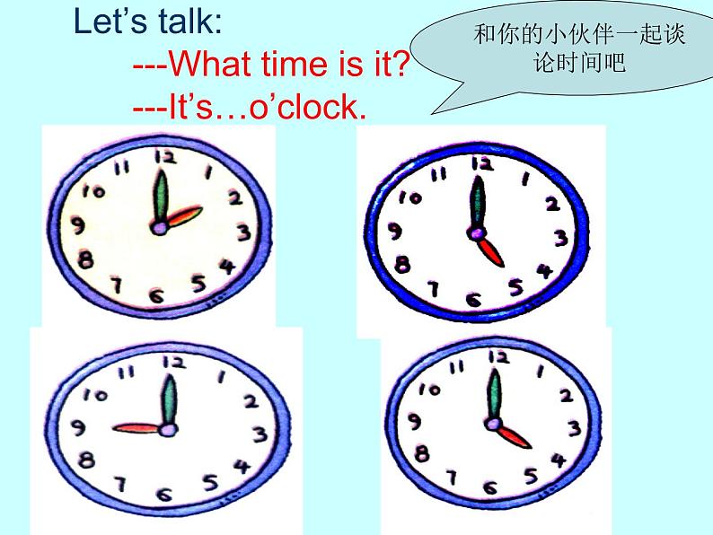 A:What time is it?B:It’s … ’clck. It’s time fr…A: OK. It’s time fr…是…的时间了。