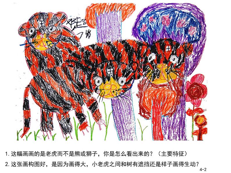 1.这幅画画的是老虎而不是熊或狮子,你是怎么看出来的?(主要特征)2.这张画构图好,是因为画得大,小老虎之间和树有遮挡还是样子画得生动?