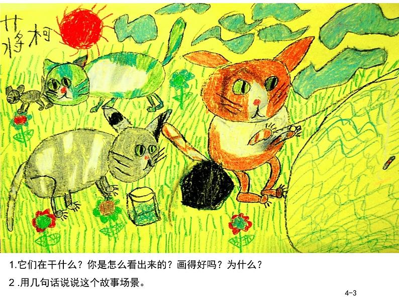 1.它们在干什么?你是怎么看出来的?画得好吗?为什么?2 .用几句话说说这个故事场景。