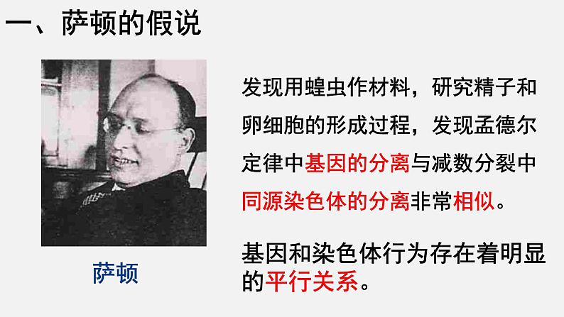 展开发现用蝗虫作材料,研究精子和卵细胞的形成过程,发现孟德尔定律中基因的分离与减数分裂中同源染色体的分离非常相似。