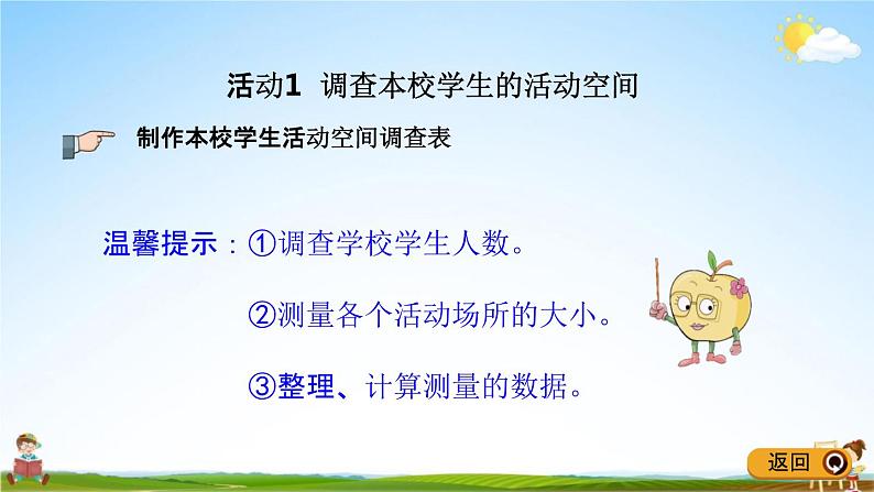 制作本校学生活动空间调查表温馨提示:①调查学校学生人数。②测量各个活动场所的大小。③整理、计算测量的数据。