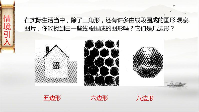 在实际生活当中,除了三角形,还有许多由线段围成的图形.观察图片,你能找到由一些线段围成的图形吗?它们是几边形?