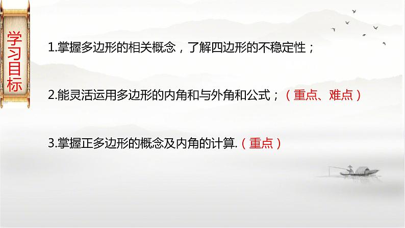 1.多边形的相关概念,四边形的不稳定性;2.n边形的内角和定理,n边形的外角和定理.