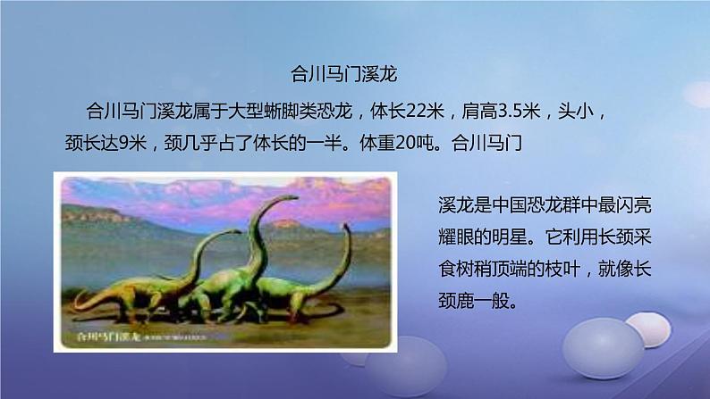 合川马门溪龙属于大型蜥脚类恐龙,体长22米,肩高3.5米,头小,颈长达9米,颈几乎占了体长的一半。体重20吨。合川马门