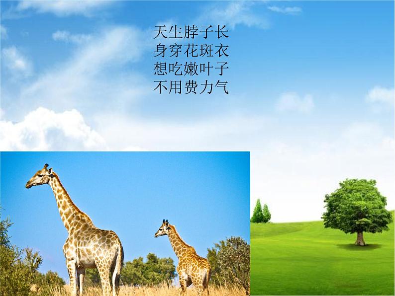 天生脖子长 身穿花斑衣 想吃嫩叶子 不用费力气