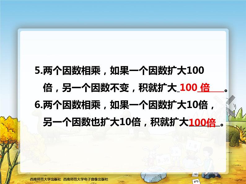 5.两个因数相乘,如果一个因数扩大100 倍,另一个因数不变,积就扩大 100 倍 。6.两个因数相乘,如果一个因数扩大10倍, 另一个因数也扩大10倍,积就扩大 。
