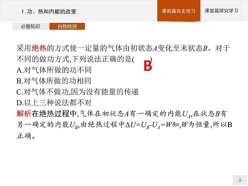 采用绝热的方式使一定量的气体由初状态A变化至末状态B。对于不同的做功方式,下列说法正确的是( )A.对气体所做的功不同B.对气体所做的功相同C.对气体不做功,因为没有能量的传递D.以上三种说法都不对解析在绝热过程中,气体在初状态A有一确定的内能UA,在状态B有另一确定的内能UB,由绝热过程中ΔU=UB-UA=W知,W为恒量,所以B正确。
