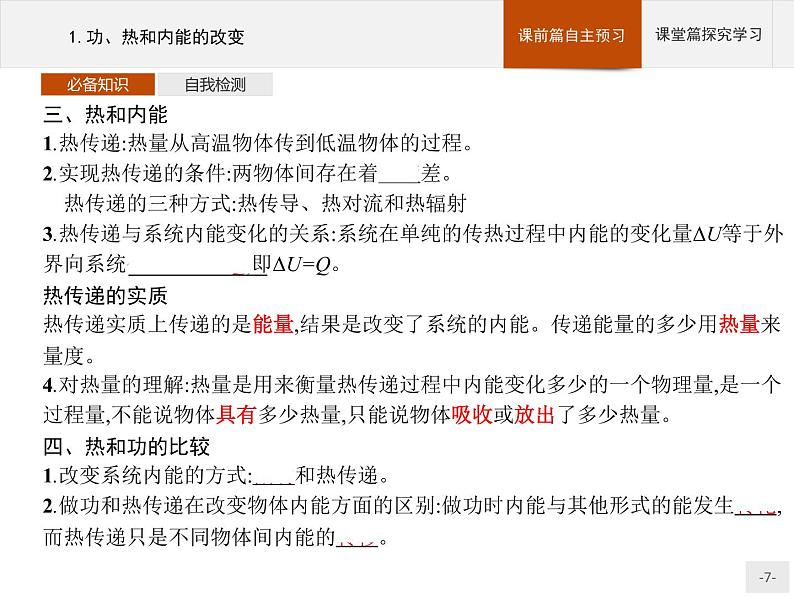 三、热和内能1.热传递:热量从高温物体传到低温物体的过程。2.实现热传递的条件:两物体间存在着温度差。 热传递的三种方式:热传导、热对流和热辐射3.热传递与系统内能变化的关系:系统在单纯的传热过程中内能的变化量ΔU等于外界向系统传递的热量Q,即ΔU=Q。热传递的实质热传递实质上传递的是能量,结果是改变了系统的内能。传递能量的多少用热量来量度。4.对热量的理解:热量是用来衡量热传递过程中内能变化多少的一个物理量,是一个过程量,不能说物体具有多少热量,只能说物体吸收或放出了多少热量。四、热和功的比较1.改变系统内能的方式:做功和热传递。2.做功和热传递在改变物体内能方面的区别:做功时内能与其他形式的能发生转化;而热传递只是不同物体间内能的转移。