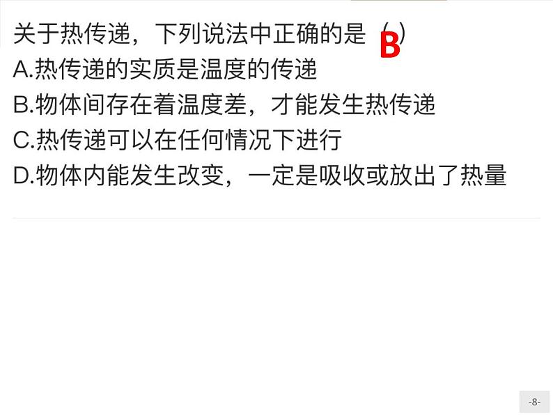 以下所述现象中,属于通过热传递改变了物体内能的是( )A.汽油机汽缸内气体被压缩B.放在空气中的一杯热水会冷却C.在转动的砂轮上磨车刀,车刀发热D.电流通过电阻丝解析汽缸压缩气体,对气体做功;在转动的砂轮上磨车刀是摩擦力对车刀做功;电流通过电阻丝并做功,所以三者都是通过做功改变物体内能的。热水放在空气中,通过热辐射等方式向外传递了热量,使自身的内能减少,温度降低,它是通过热传递方式改变内能的,所以应选B。