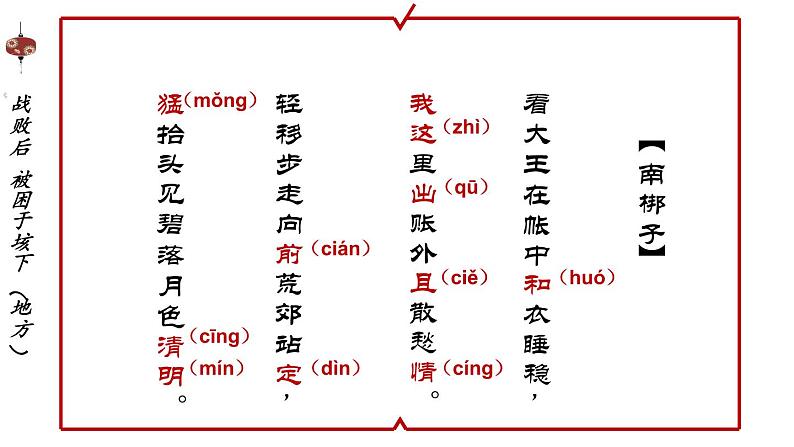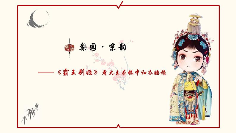 这是一份初中第七单元 梨园百花(一)唱脸谱 看大王在帐中和衣睡稳图文ppt课件,共18页。PPT课件主要包含了关键词“垓下之战”,南梆子,看大王在帐中和衣睡稳,唱的有何不同,起音圆润收音纯细,念白“无声不歌”,兰花指,身段“无动不舞”等内容,欢迎下载使用。