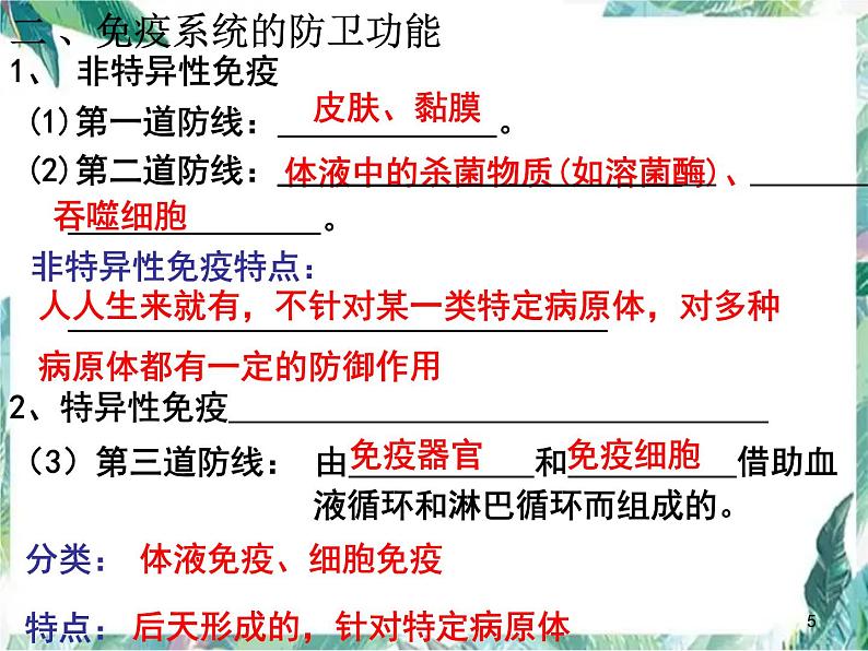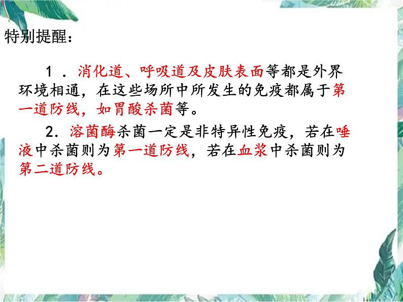 1 .消化道、呼吸道及皮肤表面等都是外界环境相通,在这些场所中所发生的免疫都属于第一道防线,如胃酸杀菌等。2.溶菌酶杀菌一定是非特异性免疫,若在唾液中杀菌则为第一道防线,若在血浆中杀菌则为第二道防线。