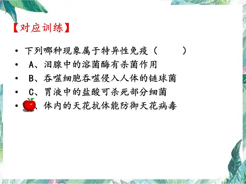 下列哪种现象属于特异性免疫( ) A、泪腺中的溶菌酶有杀菌作用 B、吞噬细胞吞噬侵入人体的链球菌 C、胃液中的盐酸可杀死部分细菌 D、体内的天花抗体能防御天花病毒