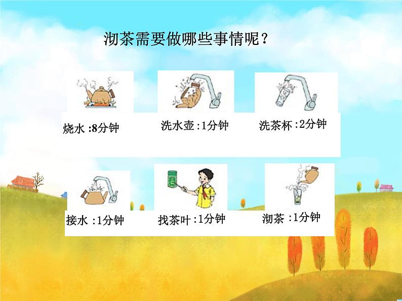 这是一份2020-2021学年8 数学广角——优化评课ppt课件,共16页。PPT课件主要包含了同时进行,泡茶的过程是怎样的,方案一,安排合理并且省时间等内容,欢迎下载使用。