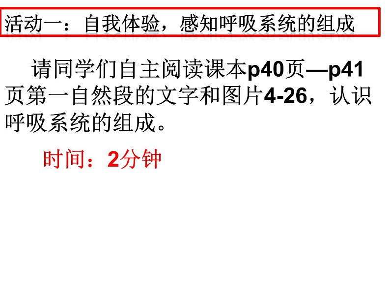 请同学们自主阅读课本p40页—p41页第一自然段的文字和图片4-26,认识呼吸系统的组成。