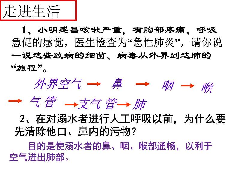 2、在对溺水者进行人工呼吸以前,为什么要 先清除他口、鼻内的污物?