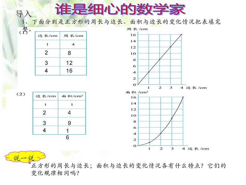 正方形的周长与边长;面积与边长的变化情况各有什么特点?它们的变化规律相同吗?