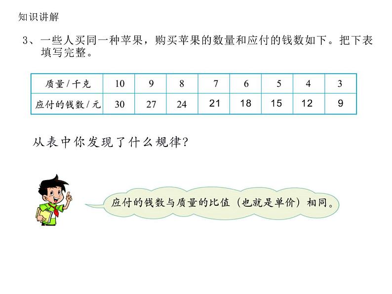 3、一些人买同一种苹果,购买苹果的数量和应付的钱数如下。把下表 填写完整。