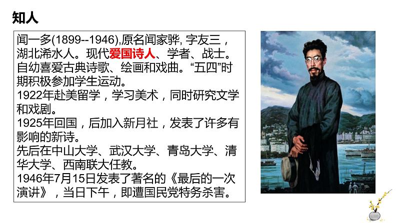 闻一多(1899--1946),原名闻家骅, 字友三,湖北浠水人。现代爱国诗人、学者、战士。 自幼喜爱古典诗歌、绘画和戏曲。“五四”时期积极参加学生运动。1922年赴美留学,学习美术,同时研究文学和戏剧。1925年回国,后加入新月社,发表了许多有影响的新诗。先后在中山大学、武汉大学、青岛大学、清华大学、西南联大任教。1946年7月15日发表了著名的《最后的一次演讲》,当日下午,即遭国民党特务杀害。