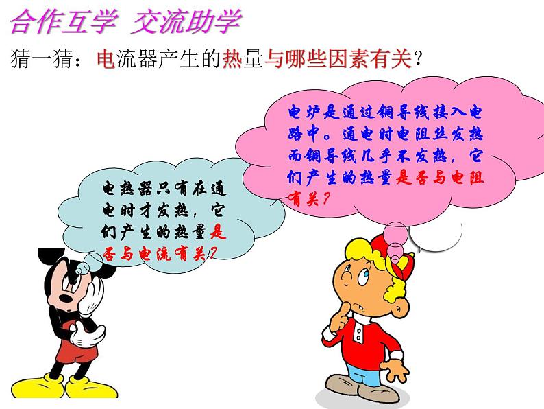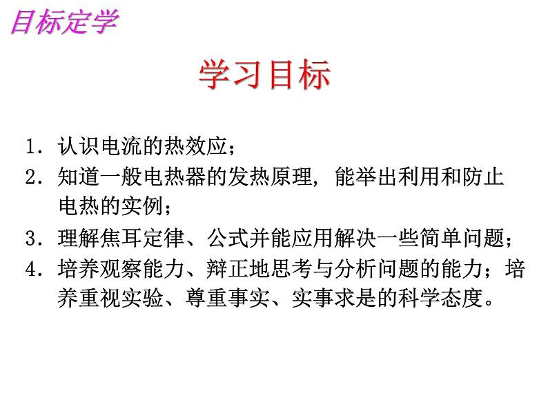 1.认识电流的热效应;2.知道一般电热器的发热原理, 能举出利用和防止 电热的实例;3.理解焦耳定律、公式并能应用解决一些简单问题;4.培养观察能力、辩正地思考与分析问题的能力;培 养重视实验、尊重事实、实事求是的科学态度。