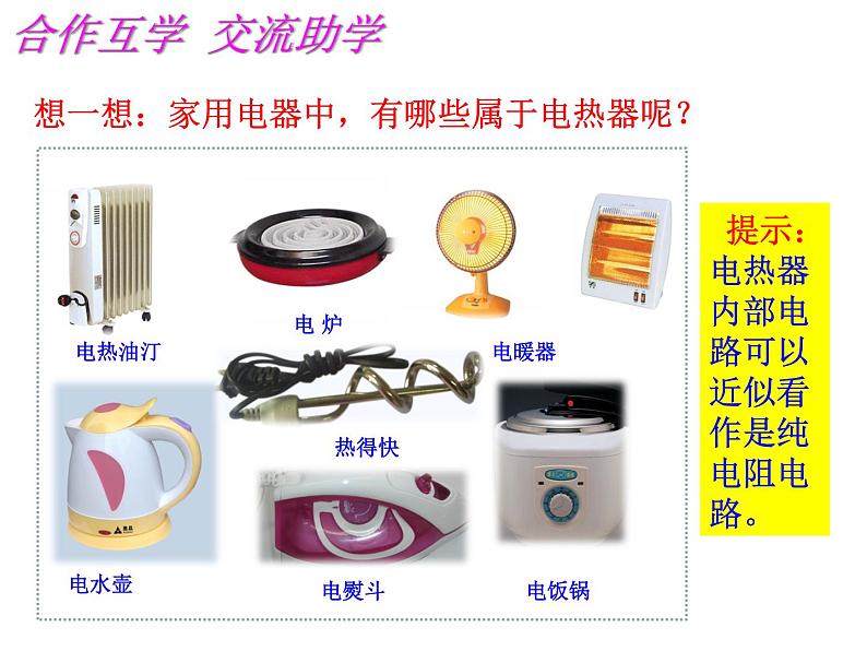 初中苏科版电热器 电流的热效应课文课件ppt: 这是一份初中苏科版电热器 电流的热效应课文课件ppt,共20页。PPT课件主要包含了电热器,电流的热效应,电能转化内能,设计过程,实验设计,猜想假设,自习书本第14页,方法一用火柴检验,方法三利用热胀冷缩,方法二利用温度计等内容,欢迎下载使用。