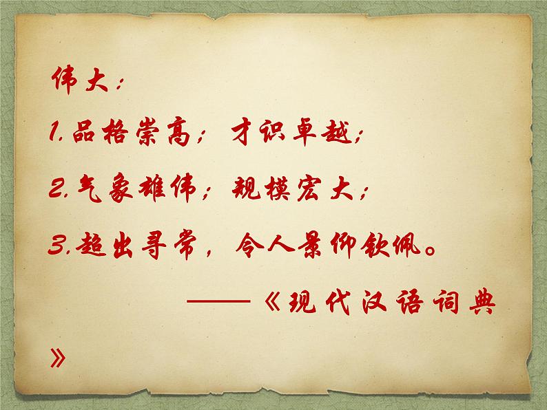 伟大:1.品格崇高;才识卓越;2.气象雄伟;规模宏大;3.超出寻常,令人景仰钦佩。 ——《现代汉语词典》