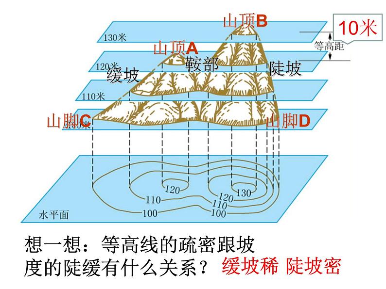 想一想:等高线的疏密跟坡度的陡缓有什么关系?