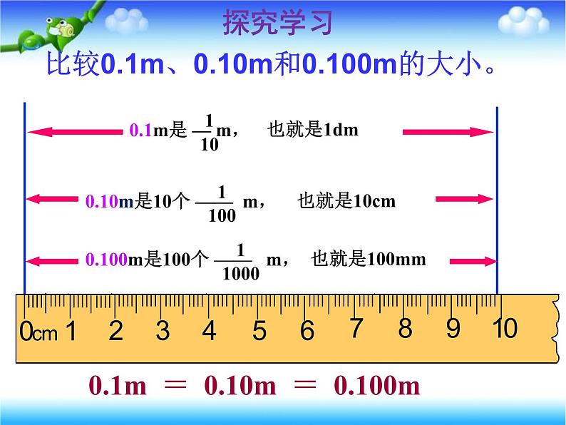 比较0.1m、0.10m和0.100m的大小。