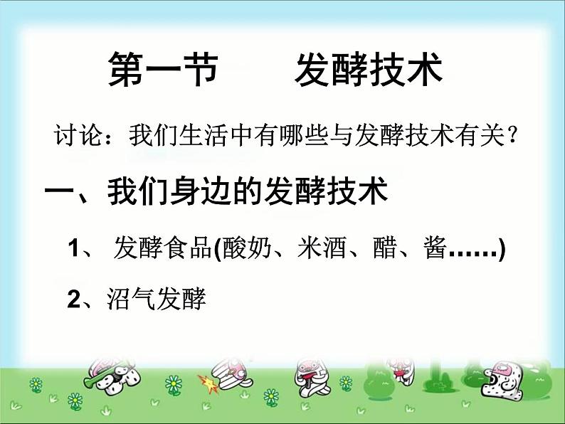 这是一份北师大版八年级下册第1节 发酵技术说课ppt课件,共18页。PPT课件主要包含了沼气发酵,身边的发酵技术,酿一瓶醇香浓郁的米酒,霉菌的菌丝,沼气发酵技术,产甲烷细菌,肥料和养殖饵料,什么是发酵技术等内容,欢迎下载使用。