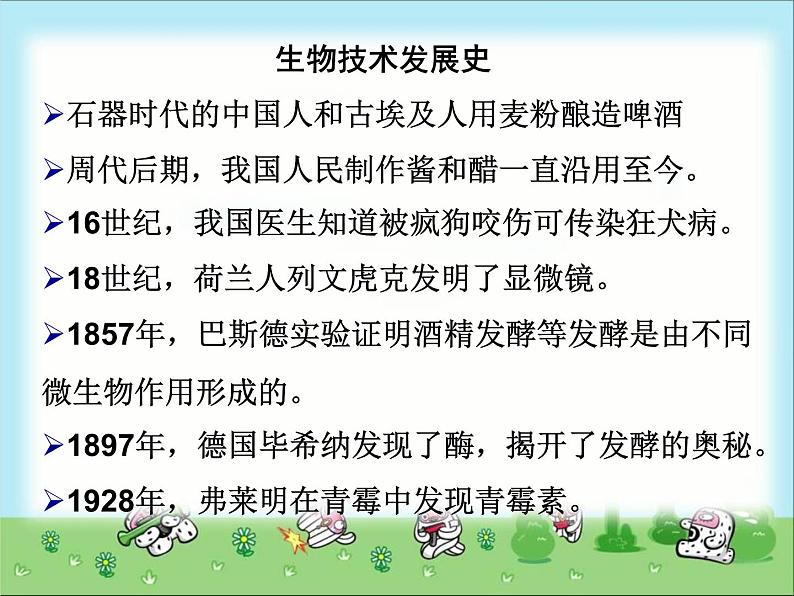 石器时代的中国人和古埃及人用麦粉酿造啤酒周代后期,我国人民制作酱和醋一直沿用至今。16世纪,我国医生知道被疯狗咬伤可传染狂犬病。18世纪,荷兰人列文虎克发明了显微镜。1857年,巴斯德实验证明酒精发酵等发酵是由不同微生物作用形成的。1897年,德国毕希纳发现了酶,揭开了发酵的奥秘。1928年,弗莱明在青霉中发现青霉素。
